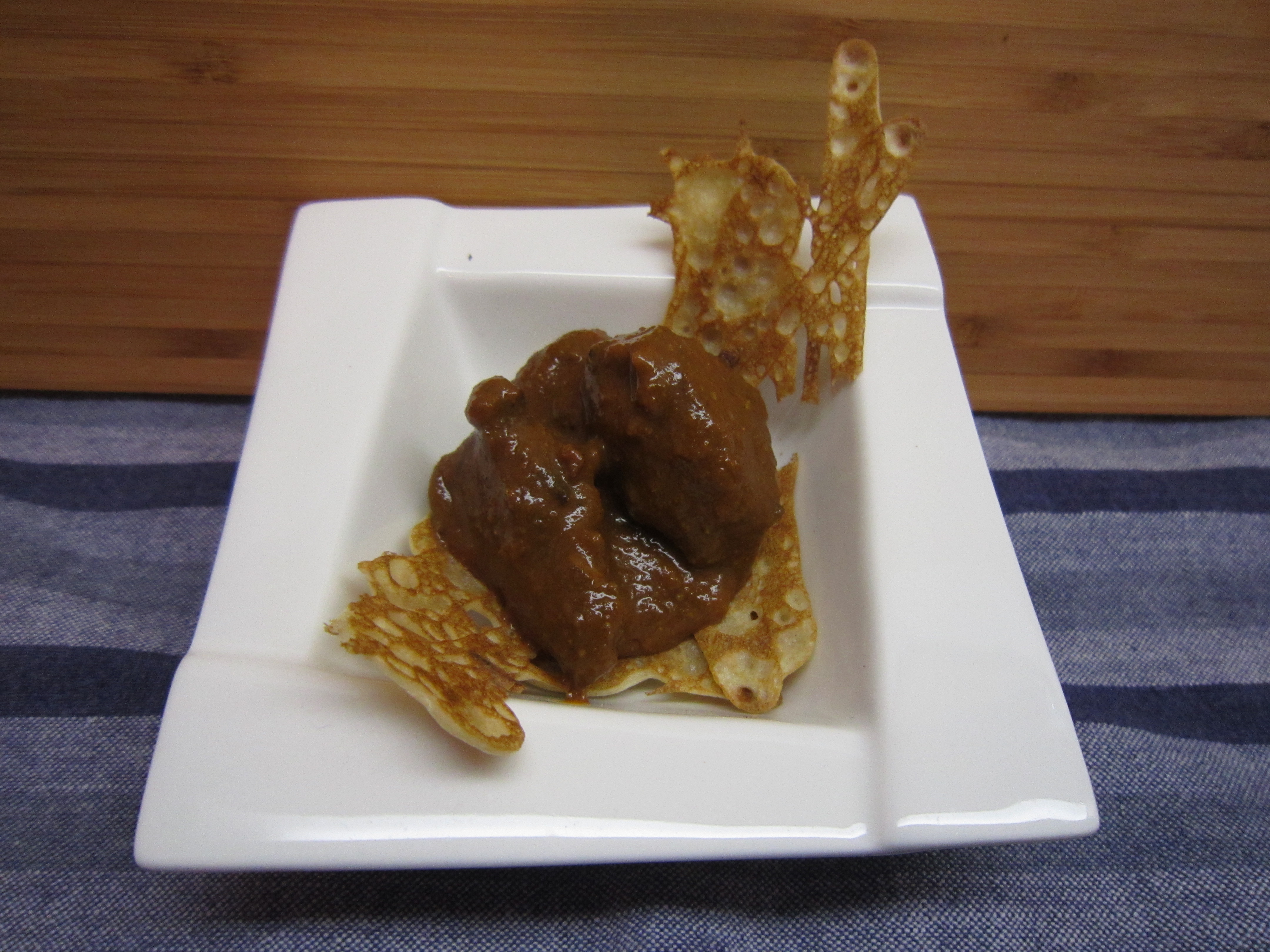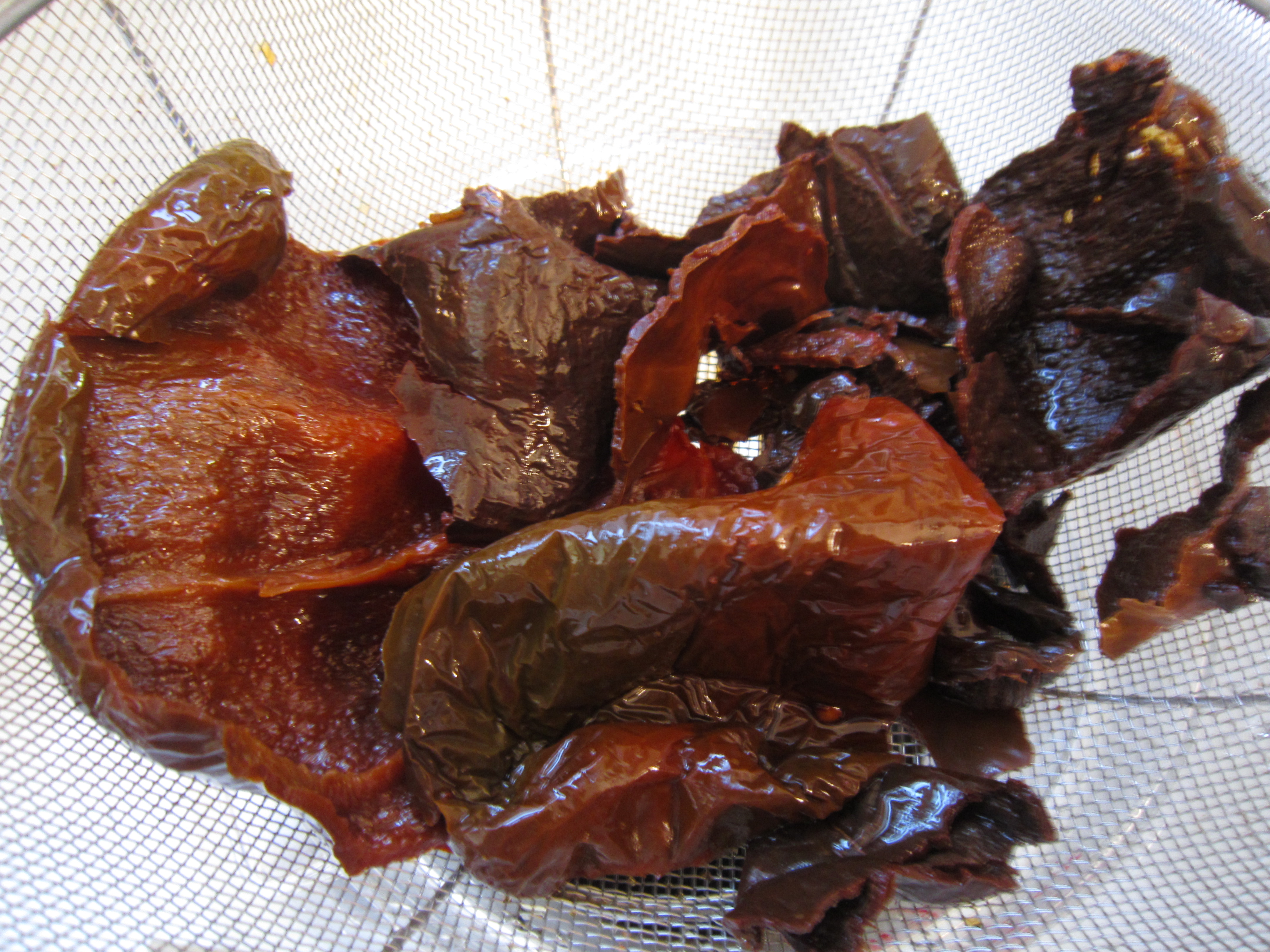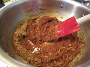 Soaked Chilies and the puree … they make don’t make exciting photos, at least not with the camera in my hands. Toasting the spices for the curry was heaven. Toasted cinnamon stick, cloves, coriander seeds, and cumin seeds all get ground up in a mortar with pestle and finally turmeric is mixed in with the ground spices. The Chilie puree is fried in a small amount of olive oil for several minutes and then the toasted ground spices added to that.