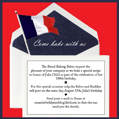 The Babes will bake and post on August 15th in honor of Julia Child’s 100th birthday, and we would love for the Buddies (that is, anyone who would like to play), to join us in posting on that day. Big thanks to Elle for creating the invitation. For the recipe we will be baking, please email Susan:   susan at wildyeastblog dot com (NB: This is an invitation for NEXT month, August. THIS month (July), Buddies are still invited to make the Easy Little Bread.)