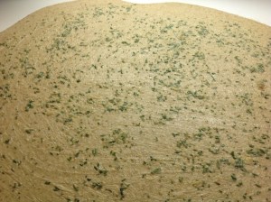 8. You now have a two strand rope shape. If for some reason some of the open roulade layers are pointing down or sideways, carefully turn them so they are facing up. Gently pinch the ends to seal. Look at the braid. If one end looks a little thinner make that your starting point. If not, just start from either end. Slowly and very gently, roll the braid sideways (horizontally) without lifting your hands from the table. You should keep those open roulade layers facing up. Pinch the end delicately. The end result should look like a giant snail shell or a giant cinnamon bun. Depending on your filling you may want to sprinkle on something (paprika, sumac, brown sugar & cinnamon). Keep in mind you don’t want to cover up the effect of the shaping.