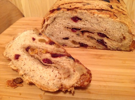 Among the Babes, we talked wildly and I think radically about lard, butter, goose fat, duck fat: as possibilities for use in this recipe. If I’d been in a full kitchen and been able to find fresh lard (not hydrogenated like the grocer tried to sell me) and duck fat, I’d be baking this with each. As things worked out all I could come up with for the fat was salted butter from my local dairy. I used all the salt called for in the recipe and the salted butter as Lien and several others thought it needed more. And I’d seek out a special dried cherry mix that Gorn really enjoys. Pick a dried fruit or dried fruit combo that you enjoy and this bread will be spectacular. I might even go really crazy and put in a few walnuts. You know I really enjoy savory but this is just the right sweet. We loved it.