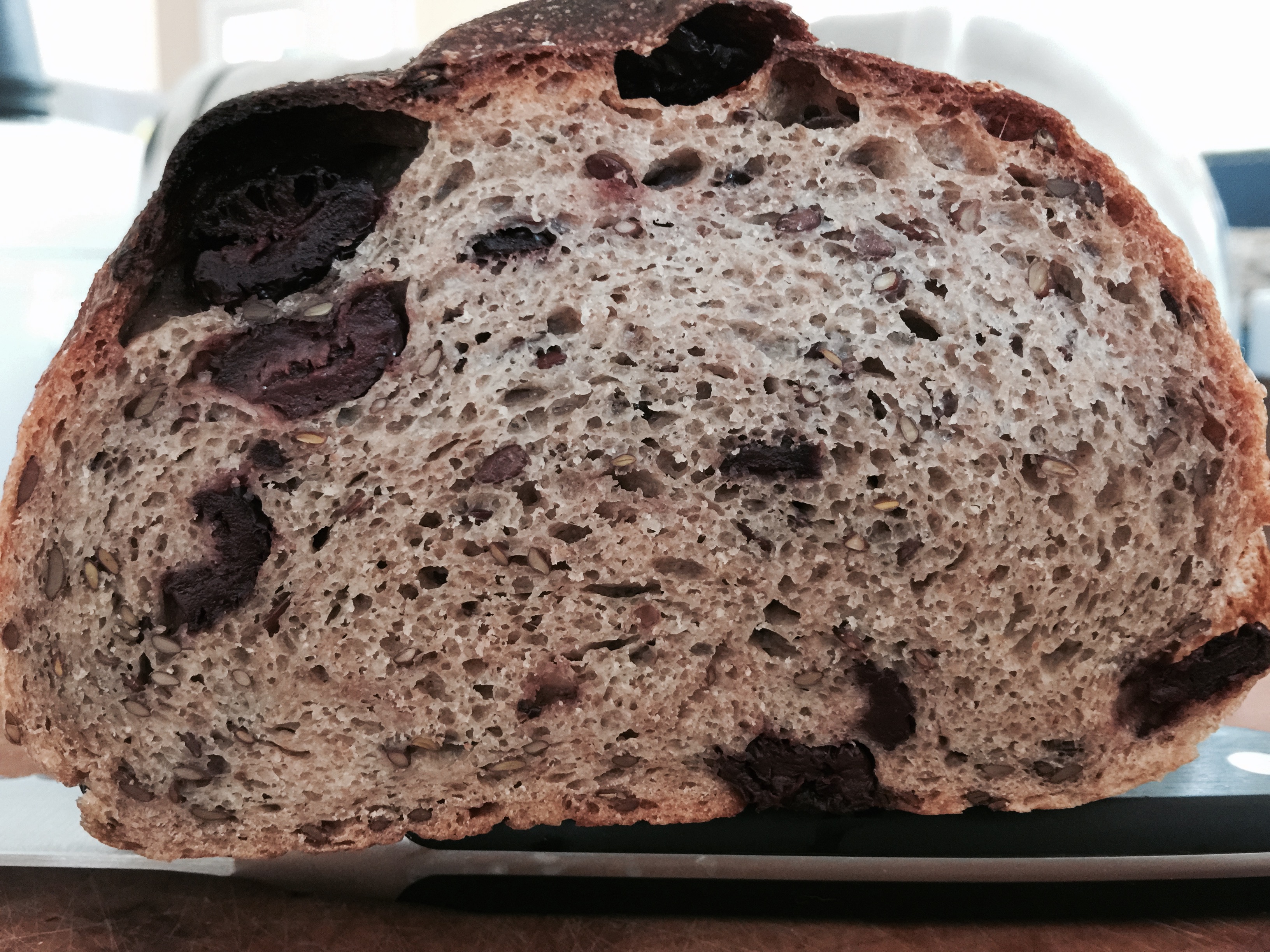 Cathy posting at Bread Experience is our hosting Kitchen of the Month with a recipe from the San Francisco Baking Institute. I love this flaxseed soaker. The whole flax seeds come through in the baked bread soft enough to give the bread a slight crunch between the teeth. I believe the softening of the flax seeds would make them as digestible as ground flax meal. While I’m in love with this bread made with the dried olives, I know there are innumerable combinations of fruits, nuts and olives that would create fabulous combinations. Next time we have company, I’m making this with apricots and walnuts or with figs and walnuts.