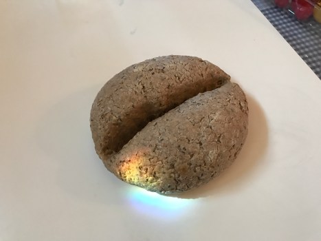 You baked it more than once! Wow! I think trying in a heated oven rather than cold, might take care of that tough crust. I was looking at your turned out dough with the little rainbow on it, and it really reminded me of that sprouted wheat dough we all made once, the one without flour? And I love your ingenuity with your long pan! Laughing about your not wanting to measure raisins with a tablespoon. I didn’t tell anyone, but I could have sworn I had raisins in the panty and then didn’t. So I found an open bag of chocolate covered raisins with a handful left and crumbled the chocolate off and gave them a rinse! I think I used a handful, but might have used a tbsp. 😉