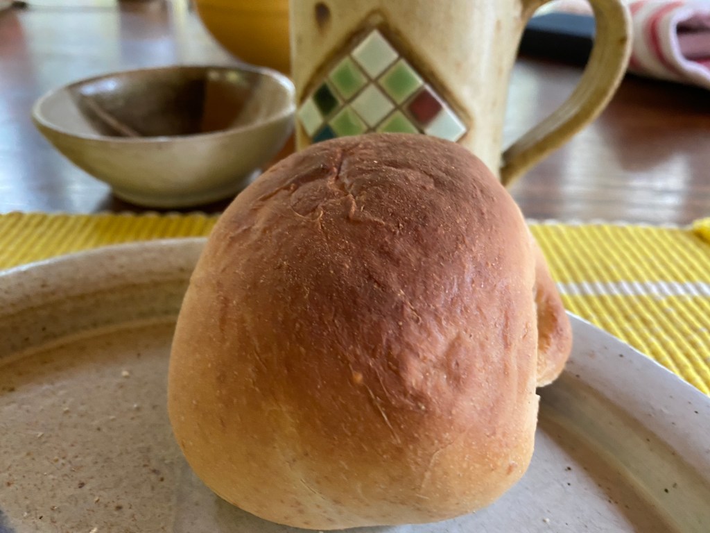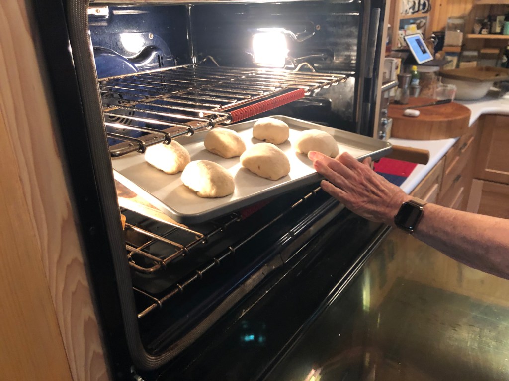 My dough weighted 1368 grams; divided by 12 made each dough ball 114 grams. Yeah, I’ve gotten comfortable with weighting and pinching dough to get same size dough balls. That does not translate to all the rolls looking the same when baked.