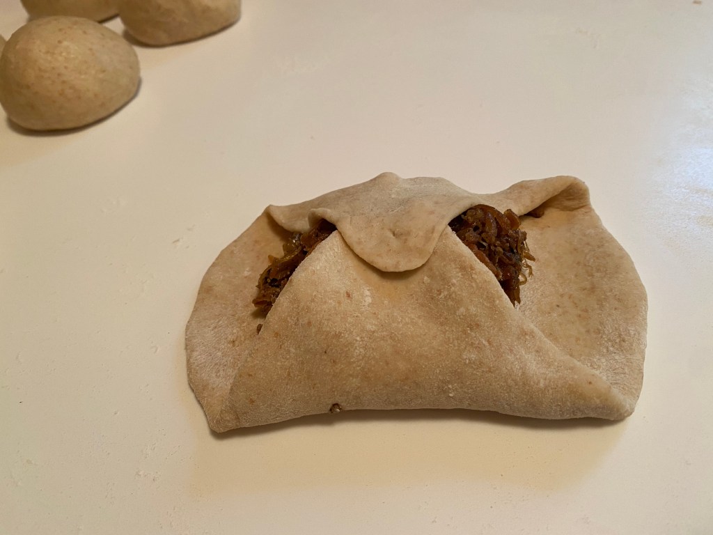 The first batch were ground turkey, onion, and sauerkraut! WOW they were great. I gave four away. We ate the remaining over the next four days. They reheated beautifully.