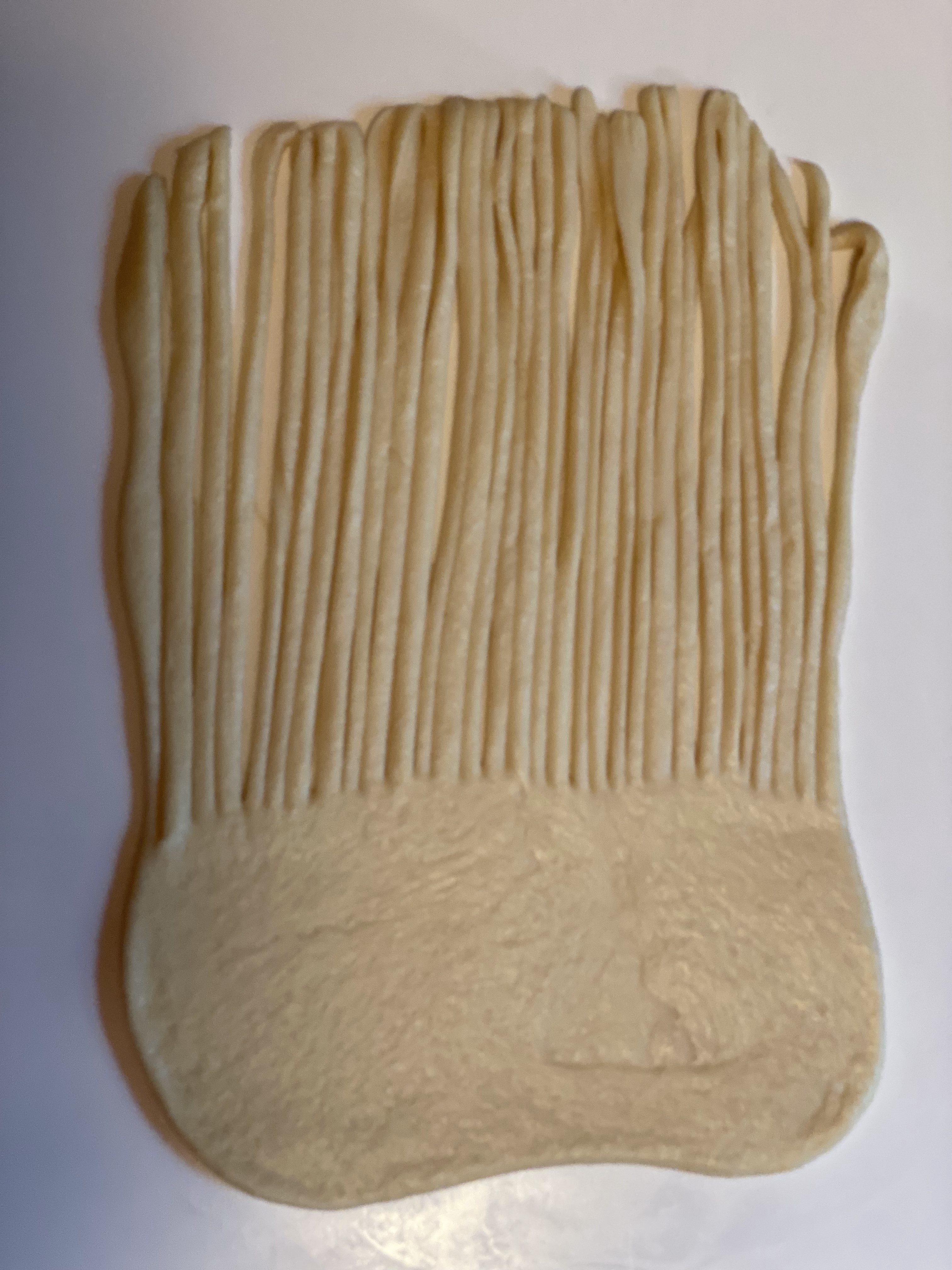 6. Dough shaping: Divide the dough into 5 pieces. Roll each piece into a thin, oblong shape, then, using a sharp object (I used my 6 inch bench scraper), start about 2/3s from the designated top and make 1/8” to ¼” cuts.
