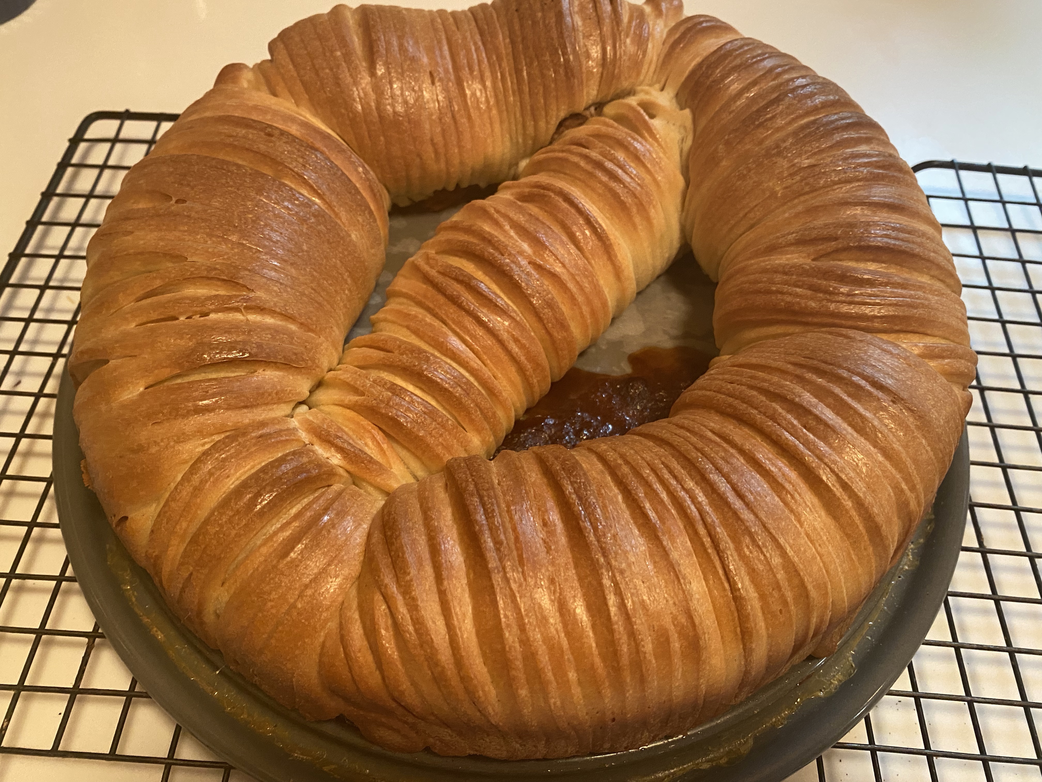 7. Add any filling now at the uncut end. Fold the sides of the filling end in slightly and roll up. Place the roll around the edge of a springform pan (buttered & lined with parchment). Continue with remaining dough balls.