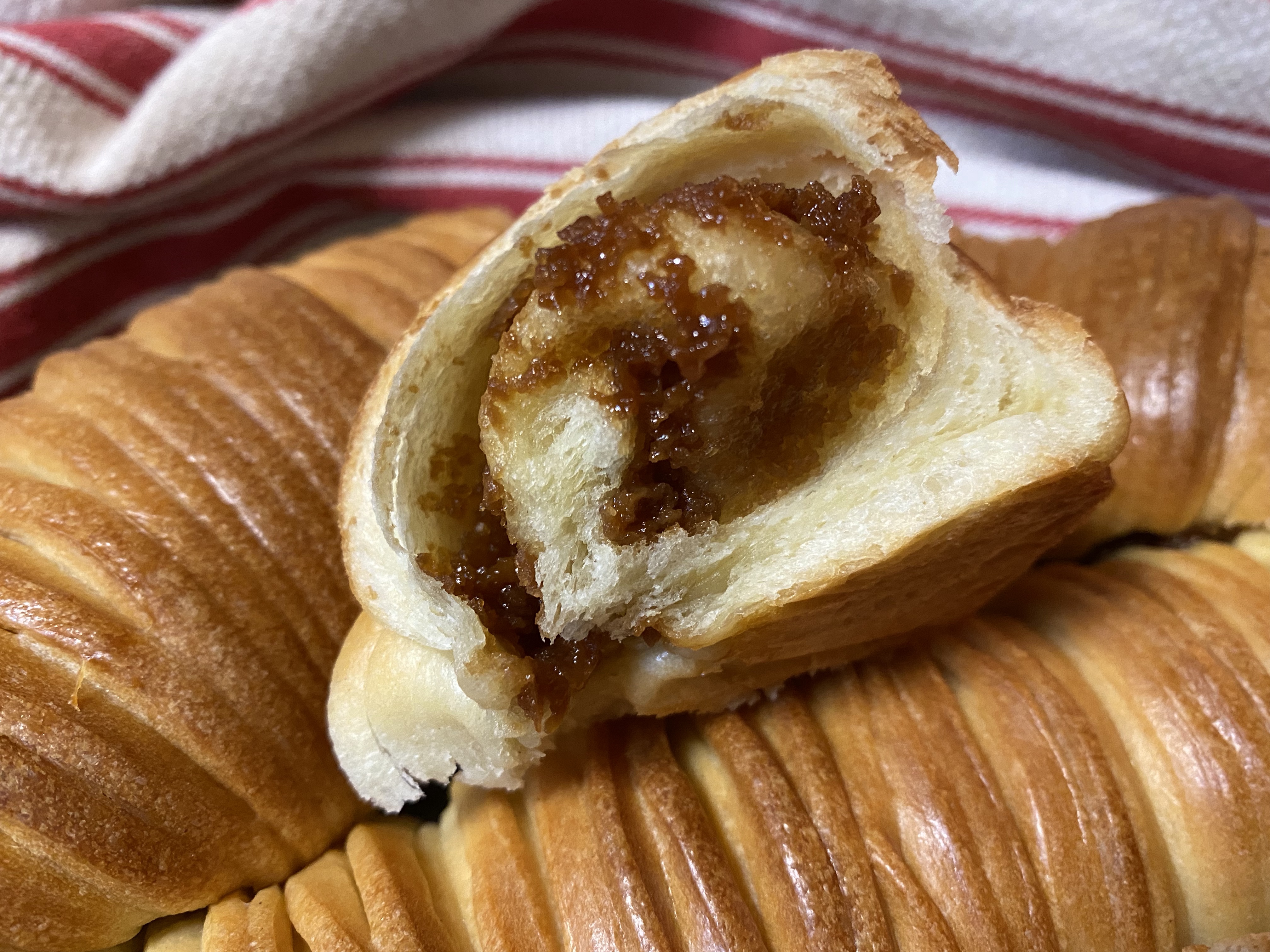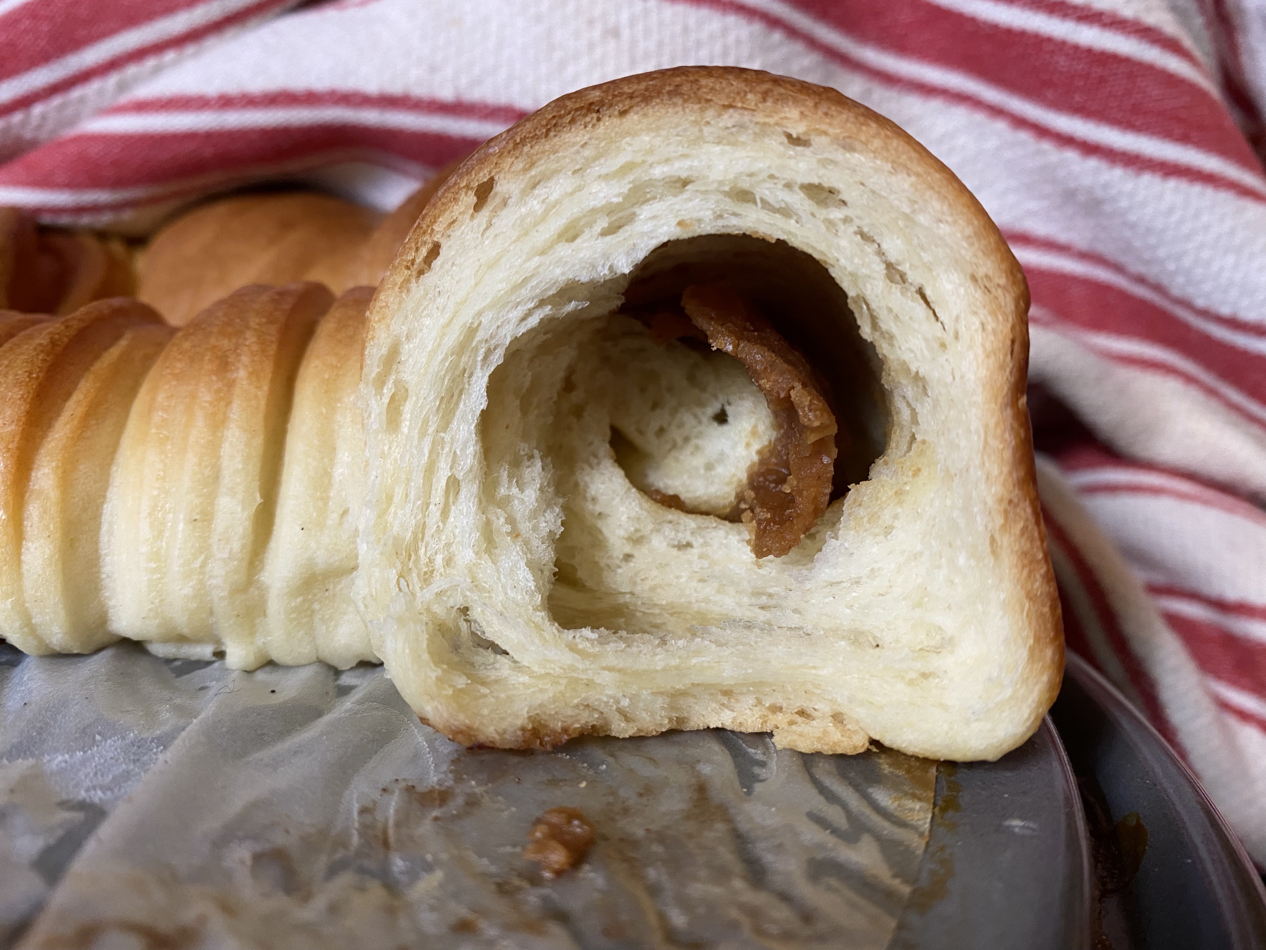 My fillings. Well, this recipe called for dividing the dough into five pieces. That gives you the opportunity to use five different fillings all in the same loaf. I used Biscoff Crunchy Cookie Butter, peanut butter, brown sugar & cinnamon, chocolate and left the last plain. Not surprisingly I liked the Biscoff and the peanut butter the best. Fillings can be sweet or savory and my mind swims with the possibilities.