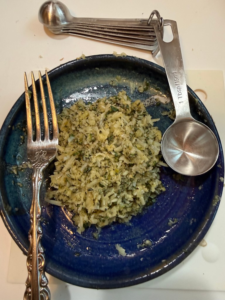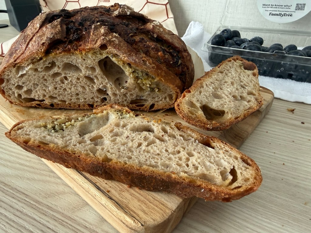 What I did use for my flavoring was dried rosemary (didn’t have fresh); 6 cloves crushed garlic cloves, and olive oil to make a paste. It was subtle but heavenly. I tried a little parmesan and almond flour with the aim being to thicken it just a little. I was pleased with the thickening I got from the almond flour but not taken with the Parmesan. The next bake my flavoring is going to be rosemary, fresh minced garlic, butter and olive oil.