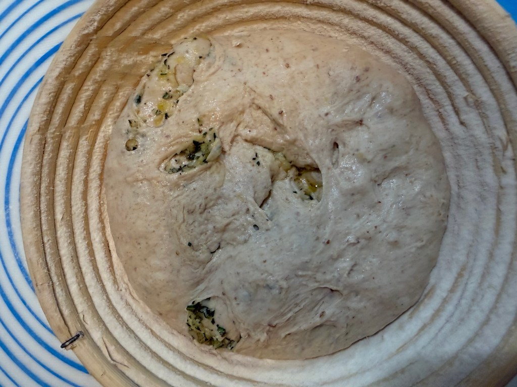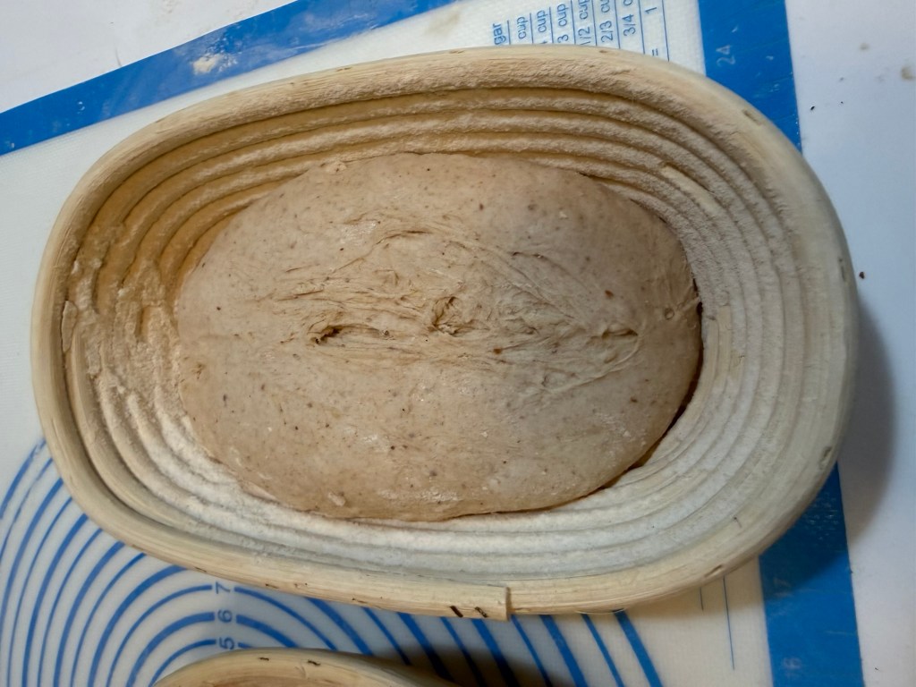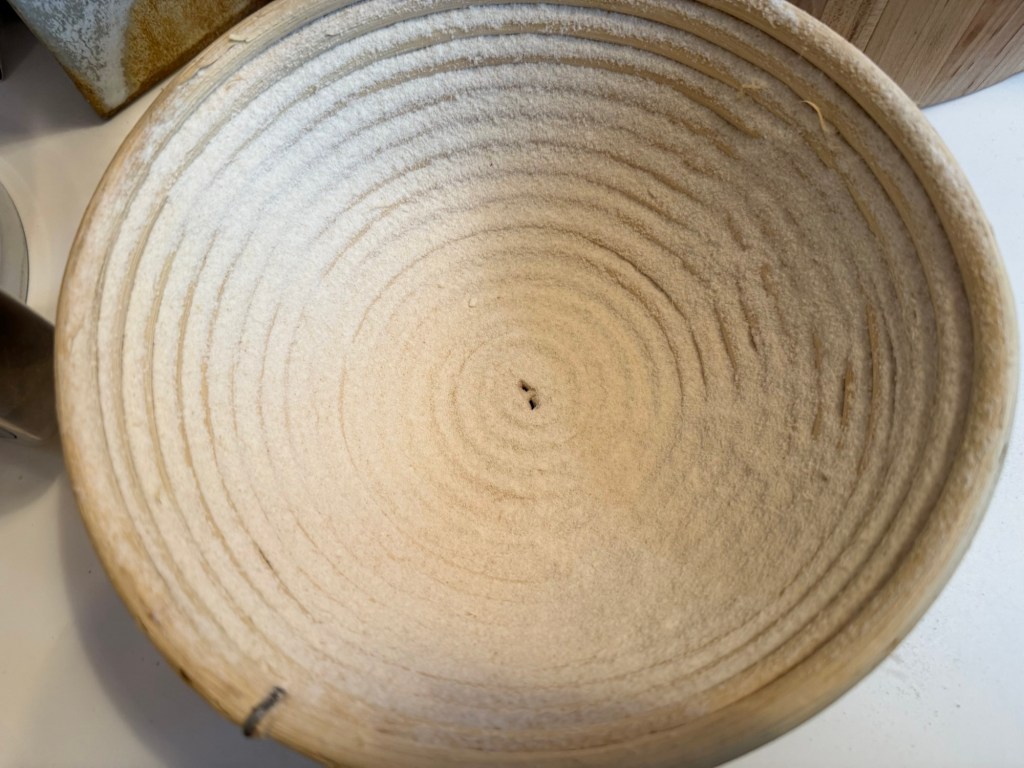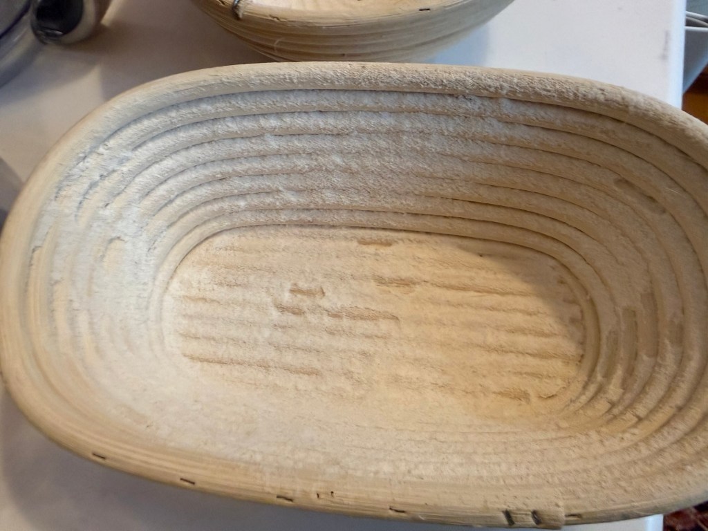 ** Generously dust a 9-inch bread basket or linen-lined bowl with flour or a mixture of four and wheat bran. I always use rice flour; the wheat bran idea is intriguing and if it occurs to me some time I may try that.