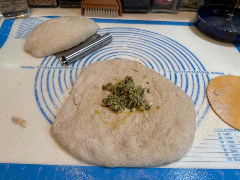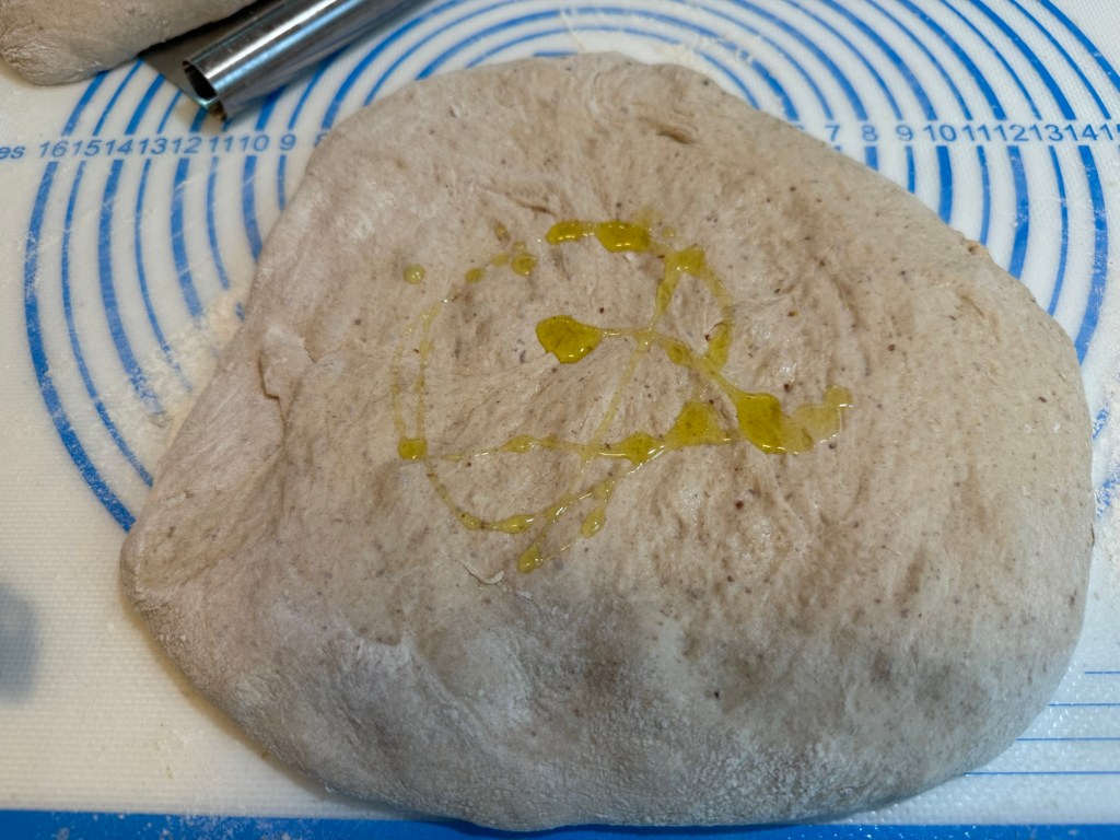 Dimple the top, make a well, and add the flavored olive oil mixture to the well. Fold the sides in, as when forming a boule, enclosing the mixture, then tighten the boule against the work surface until you just begin to see the rosemary mixture under the surface of the dough.