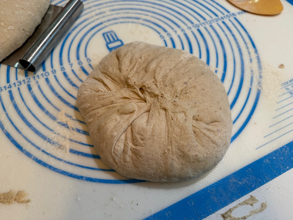 Final shape: Sprinkle rice flour into the bannetons and sprinkle a very light dusting of all-purpose flour over the tops of the loaves. Using your bench scraper, shimmy the dough into a round. Hold one hand over the center of the loaf, take your scraper in the other hand, and scrape evenly across the surface of the table toward the loaf, lifting it up and into the other hand. Put down the scraper and cradle the loaf in both hands. Now fold it inward and gently place it into the basket seam side up.
