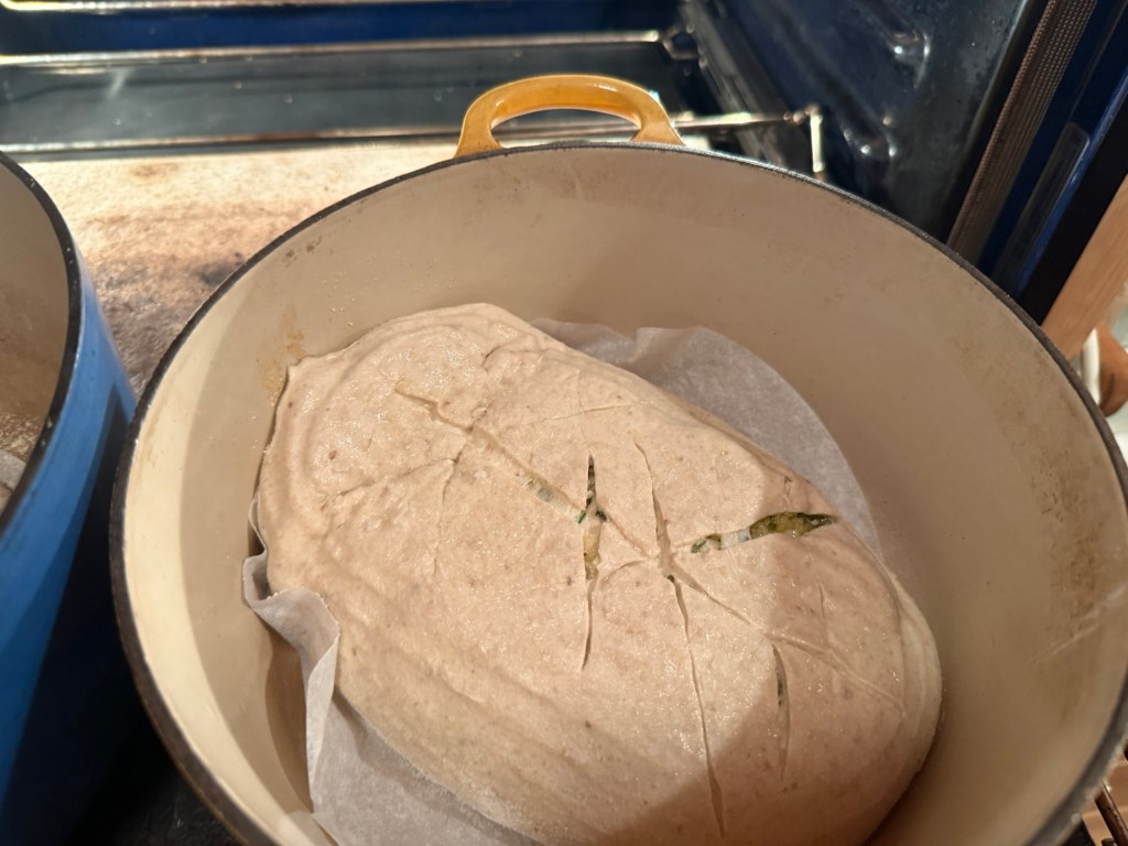 Scoring: I made four slashes, you may chose to do fewer. I suppose if you chose to make just one loaf with all the dough you could do more slashes. That would be an over the top crown. The loaf/loaves is/are now ready for the super hot Dutch oven.