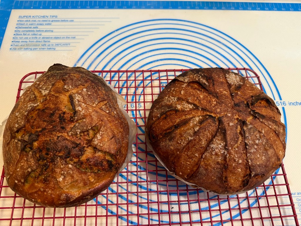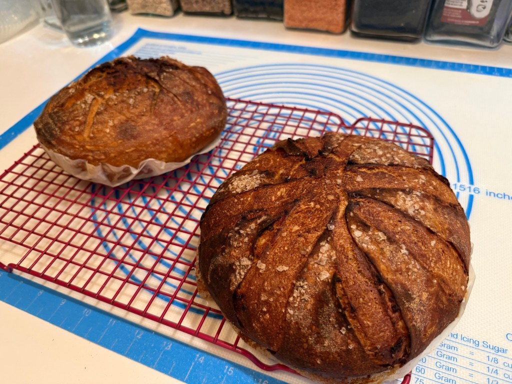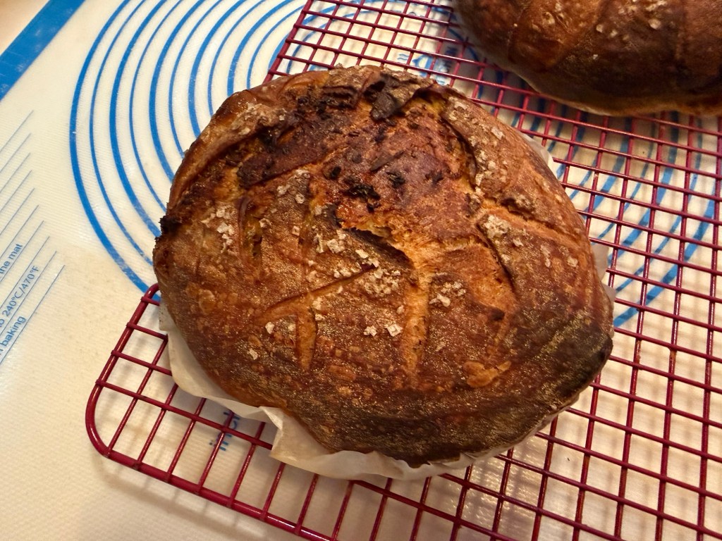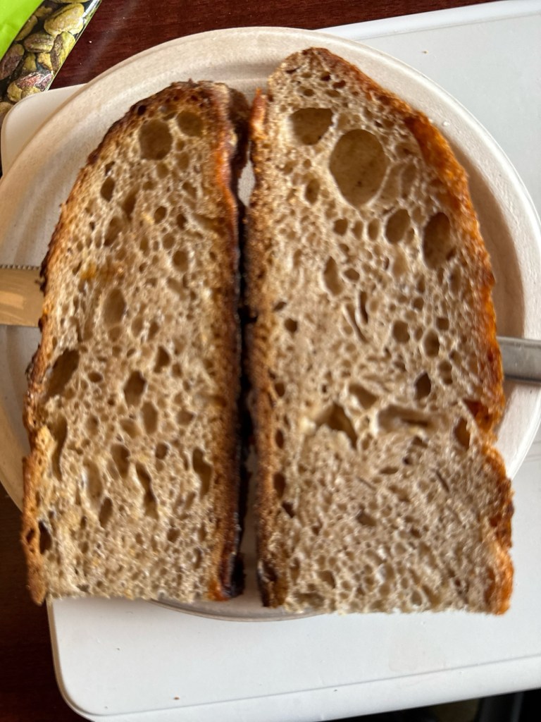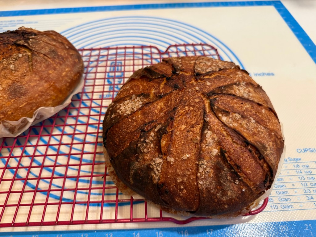 You should let the loaf cool on a cooling rack before cutting it open unless you like a gummy shiny crumb, give it at least an hour. My rule is when the internal temperature has reached whatever my room temperature is, it’s ready to slice.
