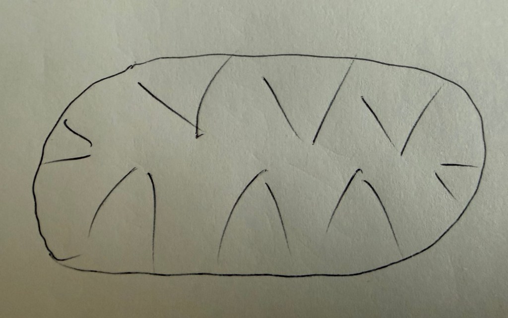 My oval/rectangular loaf did not come out with nice points. I believe if I had more carefully thought through scoring and done it as below: