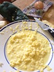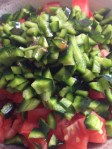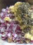 You need bread cubes, corn stripped off the cob and it’s juices, garlic clove minced, pepper (I chopped a Poblano pepper but pick your favorite), tomato, salt to taste and some seasonings (I used some fresh chopped rosemary left over from the night before, cumin and a good pinch of Aleppo pepper; pick your favorites). Then you need some liquid and a little binder. I used 2 eggs, buttermilk and I think about 7 tablespoons of corn flour and 2 tablespoons of oat bran, no sugar in sight. You do see that we’re staying within the a very healthy place right? If you check out TreatNTrick you’ll see how to do it without eggs or milk.